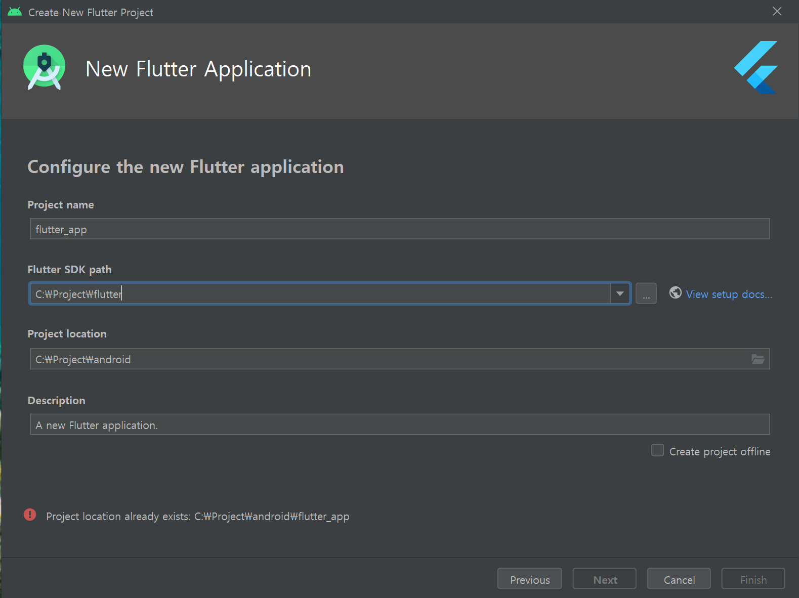 새 프로젝트 만들기를 선택하고 Next를 누르면 SDK Path를 입력하는 창이 나온다. 1번에서 받은 sdk를 지정하면 된다.