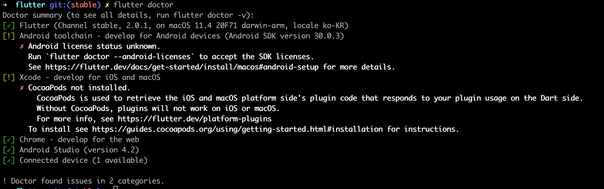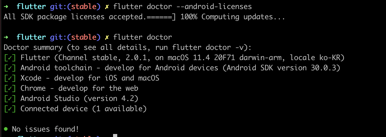 flutter에서 문제가 발생 할 경우 flutter doctor를 통해서 문제를 확인할 수 있다.