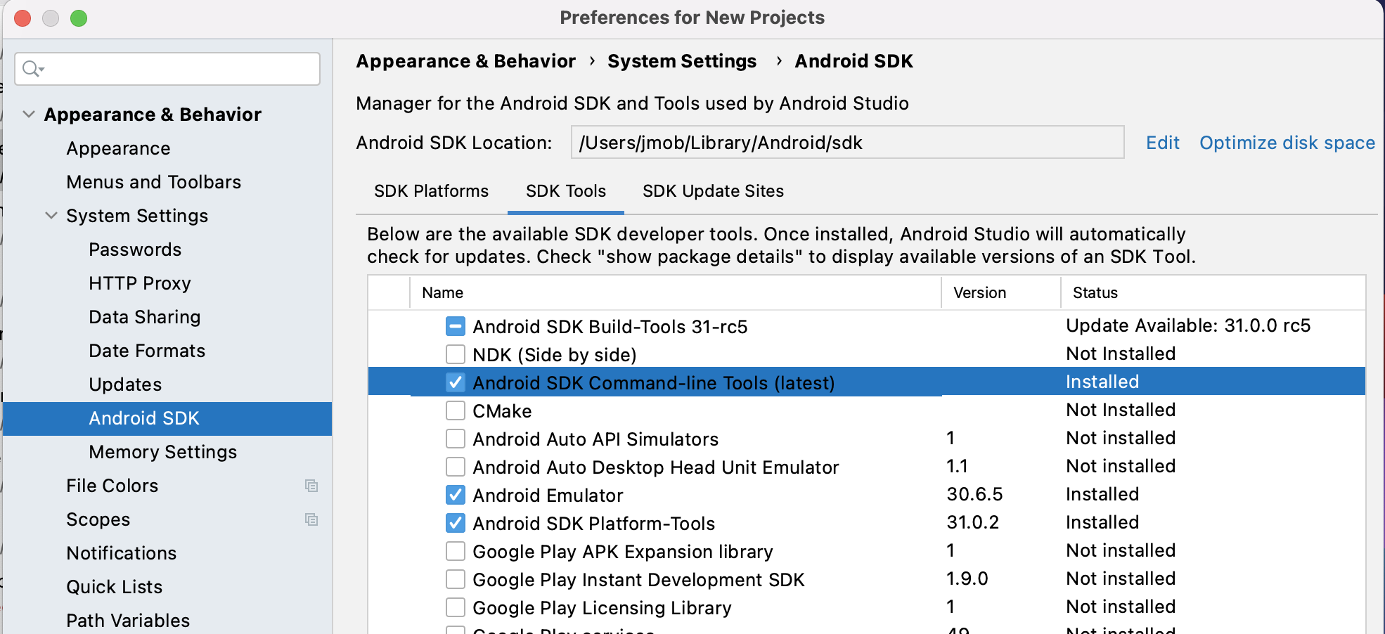 Preferences > System Setting > Android SDK > SDK tools > Android SDK Command-line Tools