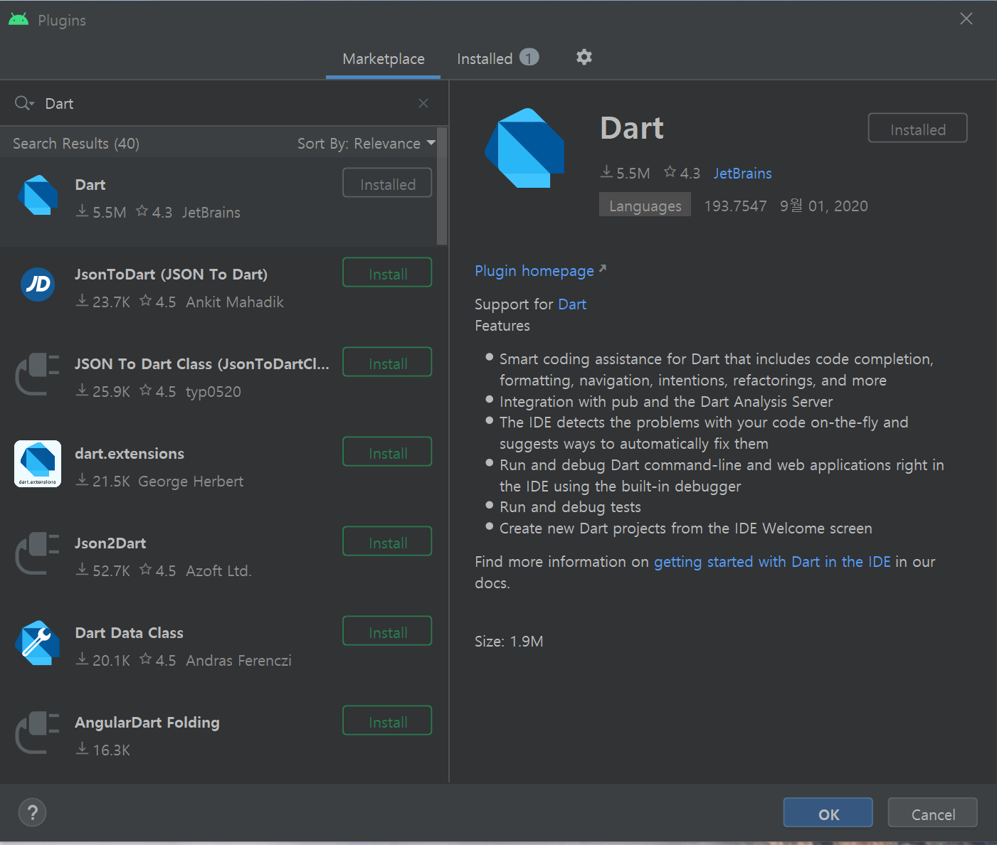 Android Studio를 켜고 Configure -> Plugins 를 선택하고, Marketplace에서 Dart와 Flutter를 설치한다. 설치 후 IDE를 다시 시작하면 첫 그림과 같이 Start a new Flutter project 를 볼 수 있다.
