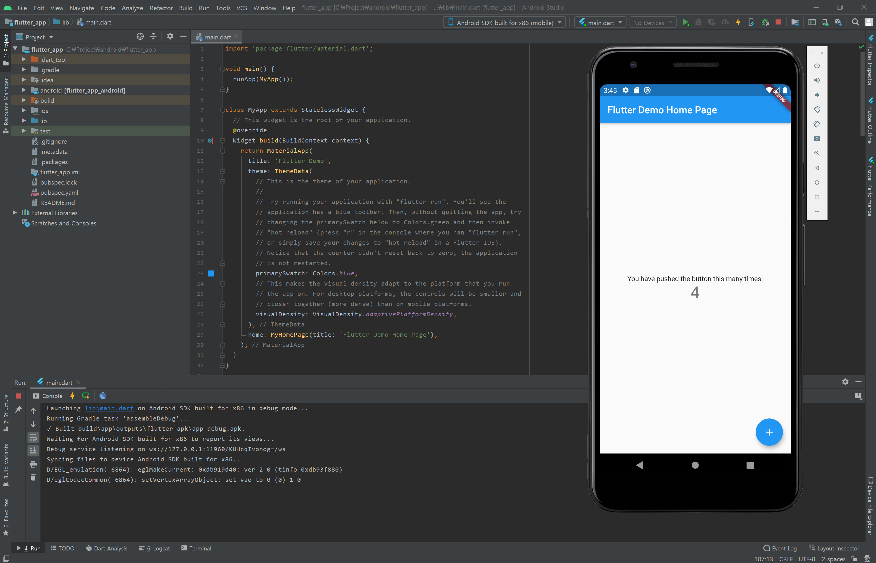 기본 프로젝트를 시작하면 Android Studio의 Emulator에서 바로 테스트할 수 있다. Windows Notebook이라... IOS에서는 확인 실행은 확인하지 못했다.